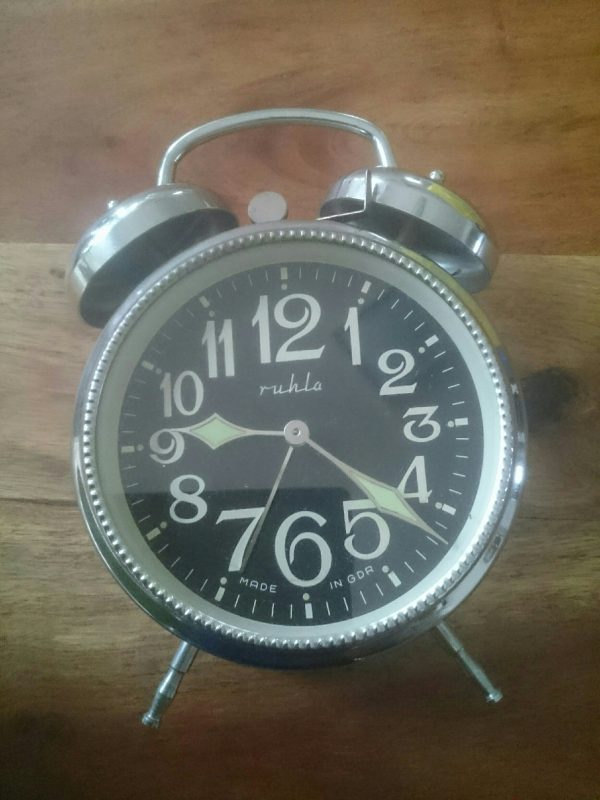 Solider Wecker mit komplettem Metallgehäuse das galvanisch verchromt ist und für 19 Mark zu haben war. Wurde als letzter DDR Wecker am 30.06.1991 zur Erinnerung hergestellt.(nicht der dargestellte sondern ein baugleiches Modell).