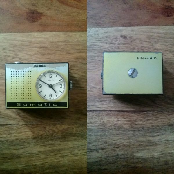 Der erste Kleinwecker von Ruhla (Breite=53mm; Höhe=38mm und Tiefe=22mm), der mit einem batteriebetriebenem Summer ab dem Jahr 1969 produziert wurde. Wurde als Sumatic l für 49,50 Mark der DDR verkauft.