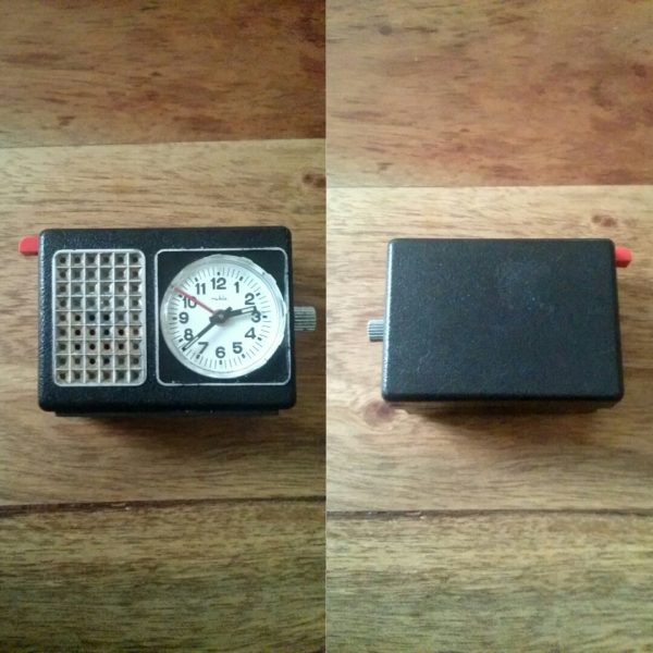 Ein kleiner Wecker, der mit einem batteriebetriebenem Summer ausgestattet ist. Die Weckzeit lässt sich über eine drehbare Lünette einstellen. Der Preis mit 48,10 Mark war in Ordnung. Die kompletten Gehäusemaße betragen 53,50 mm in der Breite; 39,00 mm in der Höhe und 23,5 mm in der Tiefe.