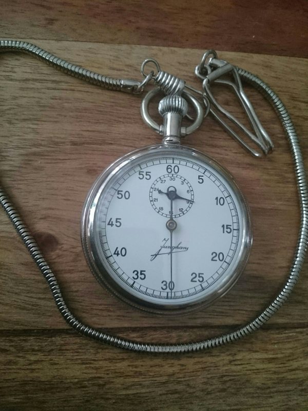 Eine interessante Stoppuhr, die ich mit und auch ohne Funktion in verschiedenen Varianten zum Tausch gegen Thieluhren anbiete. Art: Stoppuhr , Hersteller laut Zifferblatt: Junghans Markenzeichen/Aufdruck Zifferblatt JUNGHANS; Boden: Anzahl Steine: 4 Hemmung: Steinanker Unruh: Kompensationsunruh Stoßsicherung: Junghans Besonderheiten: Stoppen von 1 Sekunde (auch 2/10 Einteilungen ablesbar auf Skala zwischen den äußeren Sekundenstrichen) bis zu 30min möglich Schwingungen: Maße Werk: 19“‘Produktionszeit: 1930-iger Funktionen: Handaufzug Anzeige: oben kleiner Totalisator: Minutenzähler bis 30 Minuten, außen: Sekundenzähler bis 60 Sekunden, innen mit 10er Unterteilung mit längerem 5er Strichzifferblatt: weiß; rund, kleiner Totalisator oben; schwarz/blau bedruckt; über kleinem Totalisator: stossgeschützt, Zeiger: Lanze, schwarz; Zentrumszeiger mit rundem, ösenartigem Gegengewicht; kleiner Zeiger (verdeckt) mit bauchigem Gegengewicht Gehäuseform: rund mit Start/Stopp/Nulldrücker (runde Zwiebel-Krone); mit Ringbügel um Krone Gehäusedurchmesser (mm): 49,1Gehäusematerial: Messing; verchromt; Boden: gepresst; 2 Rückdeckel, ohne Scharnier, mit Seriennummer, zeitgemäße Gebrauchsspuren.