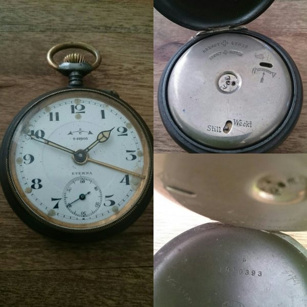 Ein Taschenuhr- Wecker in Funktion der Schweizer Firma Eterna von 1918. Leichte Gebrauchsspuren.